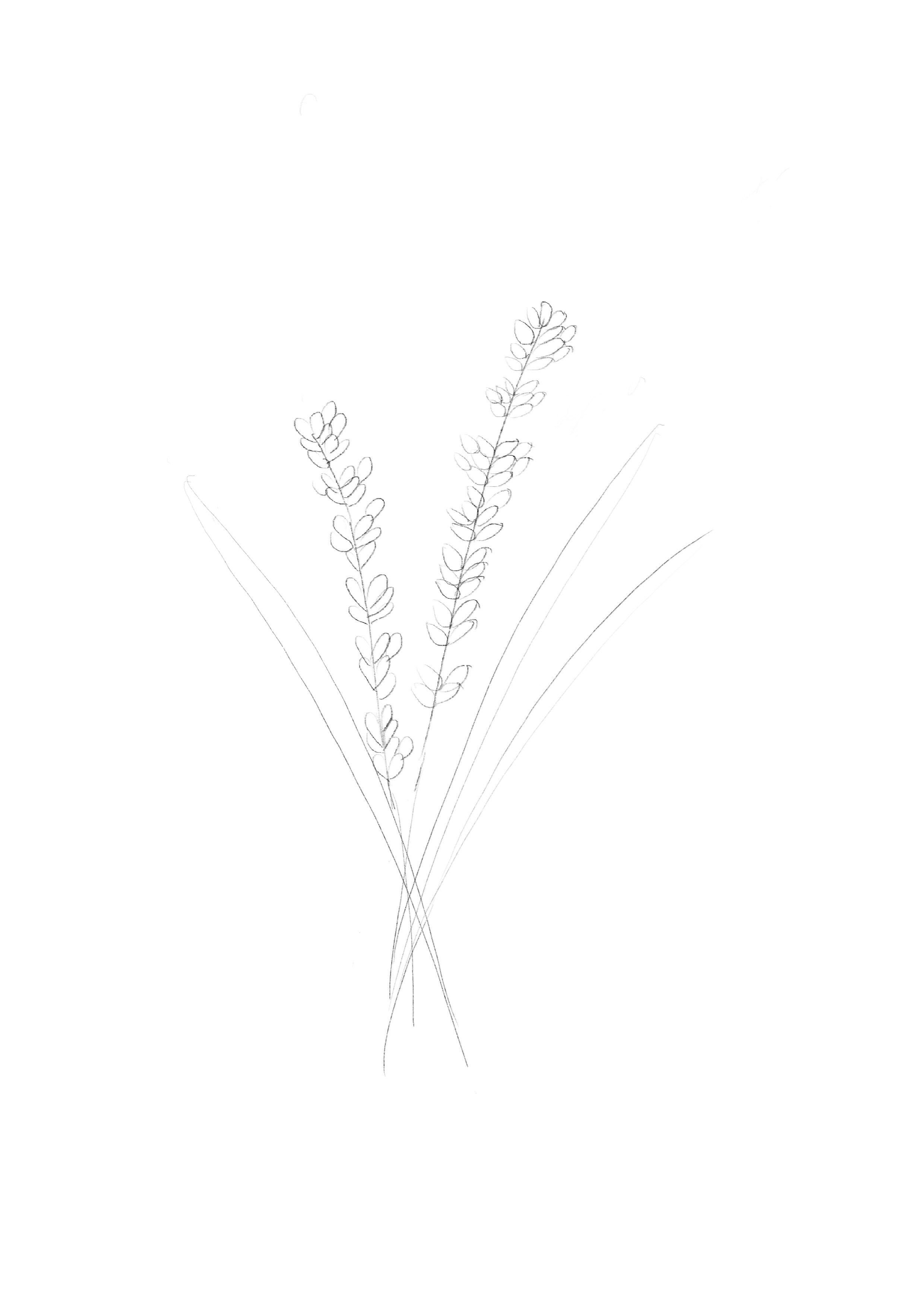 - Commencez par esquisser légèrement au crayon la forme des brins de lavande. Tracez quelques lignes courbes pour représenter les tiges et ajoutez de petites ovales pour les fleurs. Voici un modèle à télécharger.